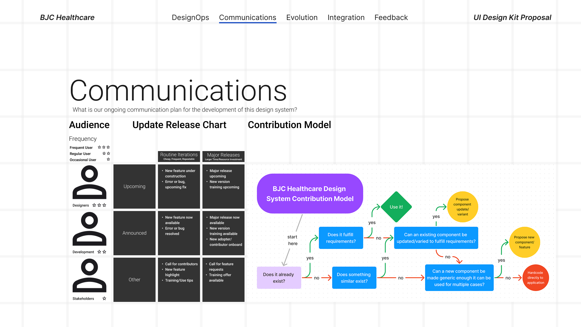 In this exploratory project, I examined the different levels and facets of DesignOps through the lens of BJC Healthcare. To achieve this, I took on the role of a BJC technology employee proposing a new design team to the company by developing an overview of our designOps needs, an operating model graphic, our design principles, a design team career ladder, defined our metrics for success and maturity, and developed a Figma design system consisting of our branded design styles and functional components to be used in our product design workflow.